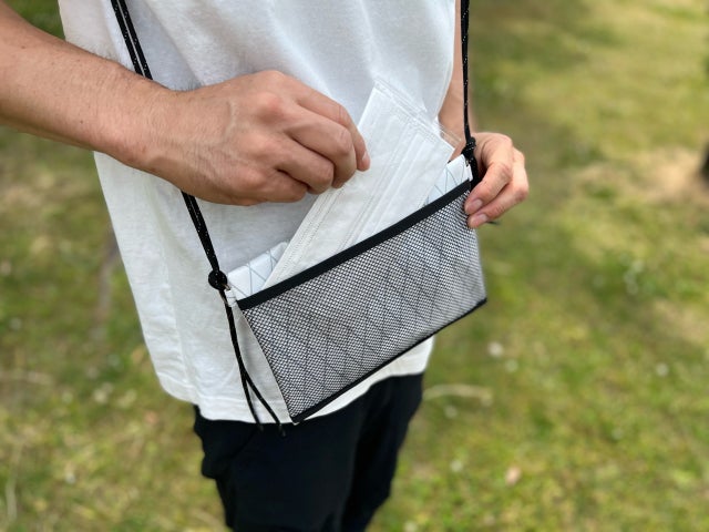 ・x-pacと水が染み込みにくい止水ファスナーを使用しサコッシュ内への水の進入をブロック