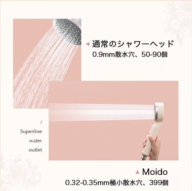 Moidoアロマシャワーヘッドは、使った瞬間に包み込まれるような優しさを感じます。まるでお花畑に囲まれるような心地の良さで、心と身体に和みを。