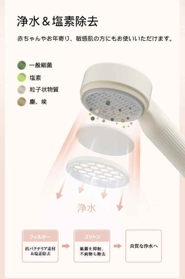 塩素、バクテリアを97.6%までカットし、お肌に優しい水でシャワーを浴びることができます。