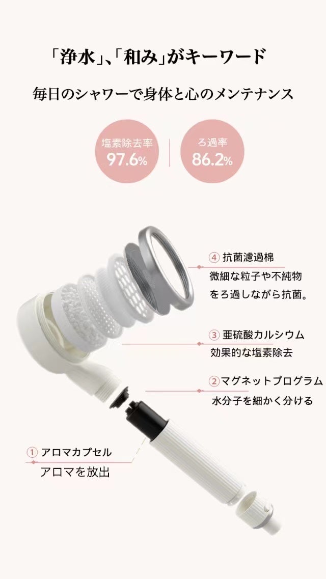 亜硫酸カルシウムビーズと植物性アロマオイルが水道水特有の残留塩酸を効果的に除去し、より快適なシャワータイムを実現します。