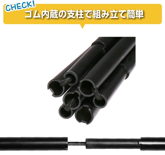アウトドアで使用するタープポールをヒントに、支柱の中にゴムを内蔵。