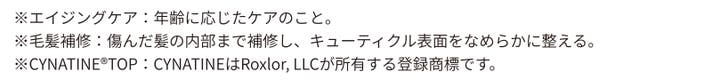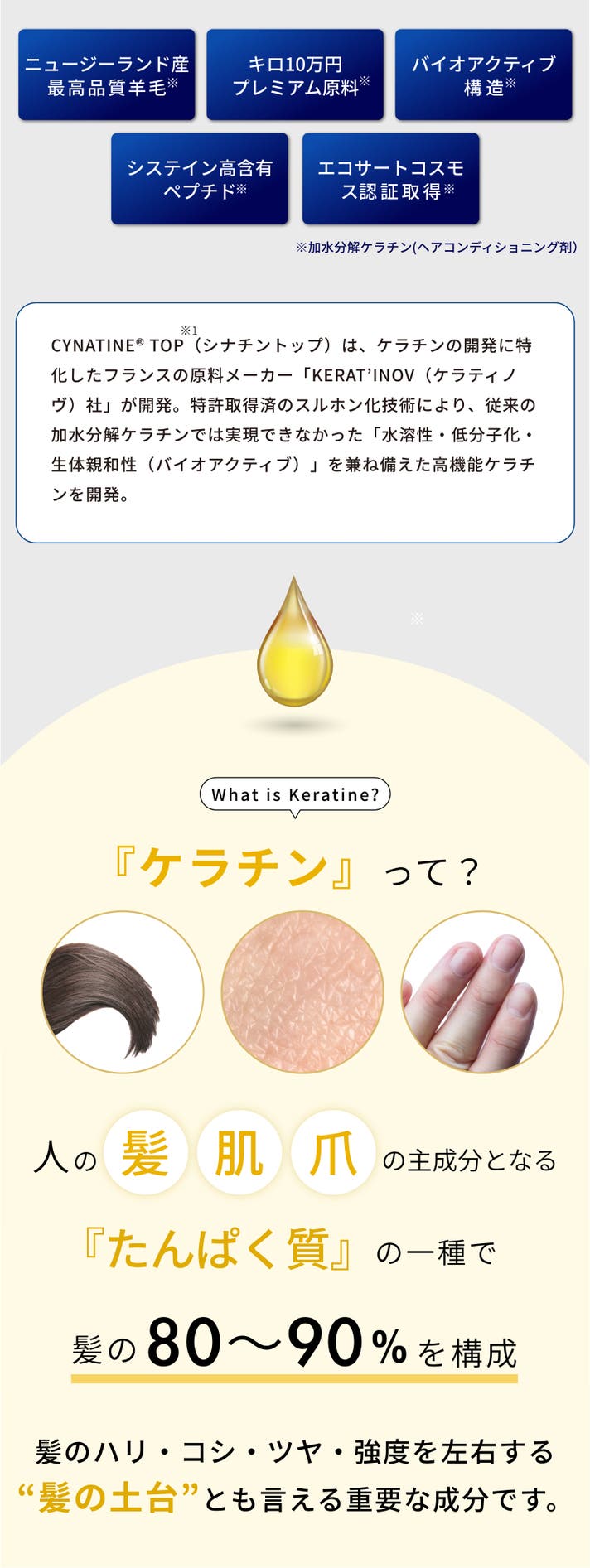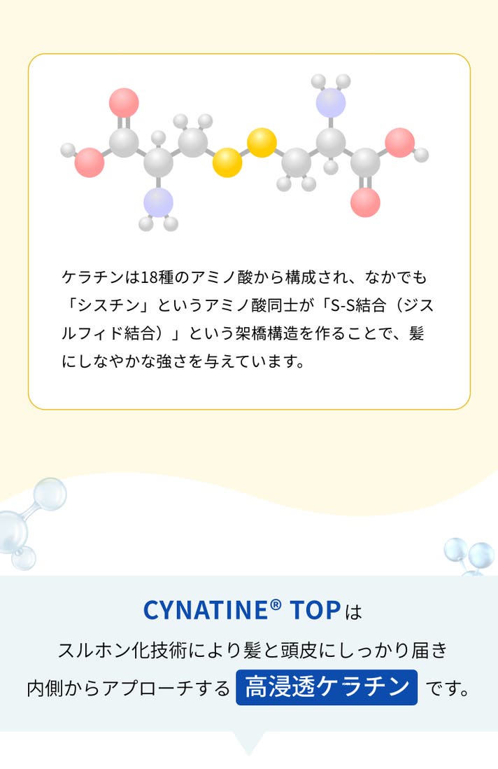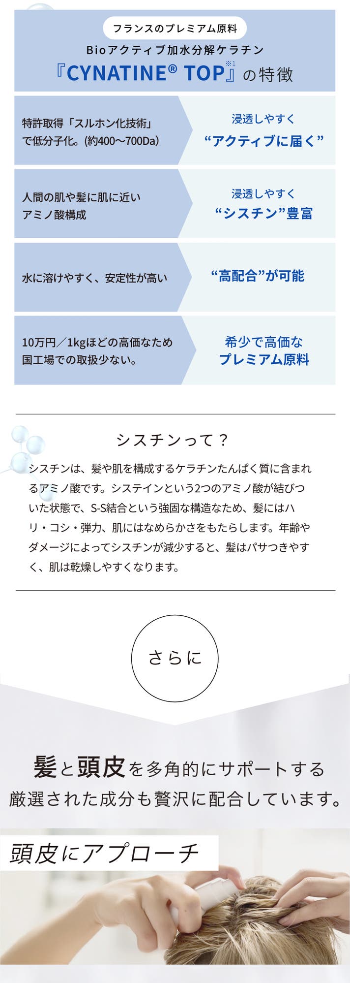 - 頭皮と毛髪に届くバイオアクティブな分子構造のケラチン「CYNATINE®TOP※」配合