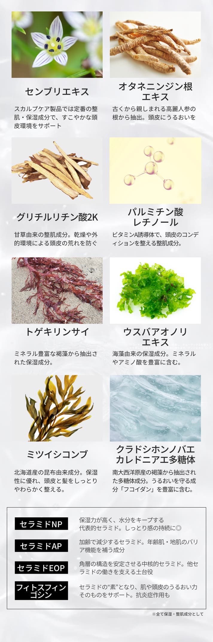 水、BG、 ペンチレングリコール、グリセリン、加水分解ケラチン(羊毛)、フクロフノリエキス、グリチルリチン酸2K、ナイアシンアミド、アスコルビルリン酸Na、 パンテノール、スクワラン、パルミチン酸レチノール、 コーン油、スサビノリエキス、トゲキリンサイ/ミツイシコンブ/ウスバアオノリエキス、クラドシホンノバエカレドニアエ多糖体、センブリエキス、 オタネニンジン根エキス、セラミドNP、セラミドAP、セラミドEOP、フィトスフィンゴシン、 コレステロール、ラウロイルラクチレートNa、カルボマー、キサンタンガム、エタノール、PEG-60水添ヒマシ油、エチルヘキシルグリセリン、 フェノキシエタノール、 ニオイテンジクアオイ油、ハッカ油