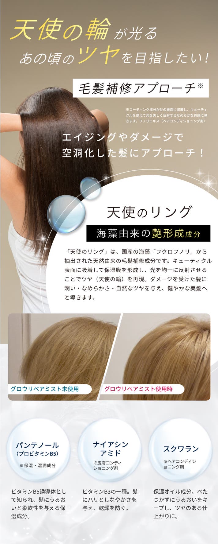現在はヘアケアブランドを立ち上げ、ハイトーンを楽しみながら健康的な髪を保つため、日頃のケアにこだわっています。正直、ブリーチ毛の私は、これまではオイルなしでは“オスライオン”のように広がってしまうのが当たり前でした。ですがこのグロウリペアミストを使ったところ、オイルなしでも毛先までまとまり、ツヤが出るという、自分でも驚く変化を実感しています。