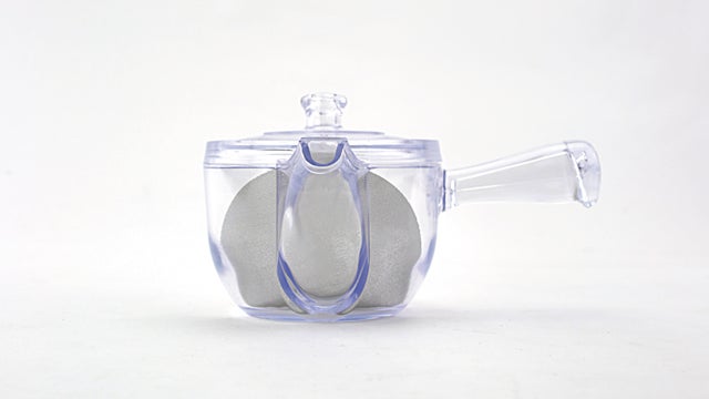 素材は、ポリカーボネートという耐熱強化樹脂(プラスチック)。落としても割れない、持っても熱くない、そして軽い(約150g)急須を作りました。