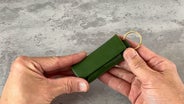 カラビナやリングと本体を繋ぐ革パーツには、革の厚みは本体の倍近い厚みに強化しています。長くお使いいただけれる革小物だからこそ、一番負荷がかかる部分には強度を高めています。