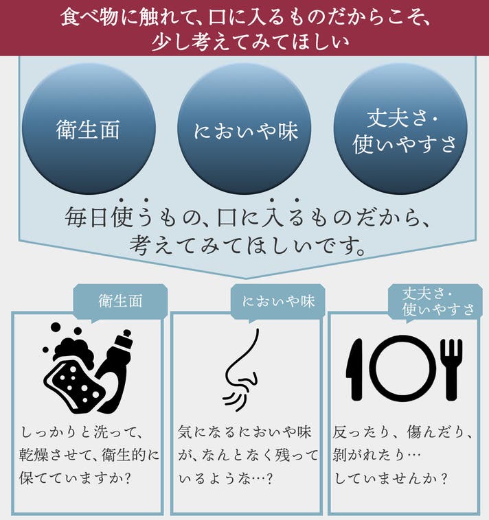 - 衛生のためにも、医療の現場で活躍するチタンで、食に触れるものも揃えたい!