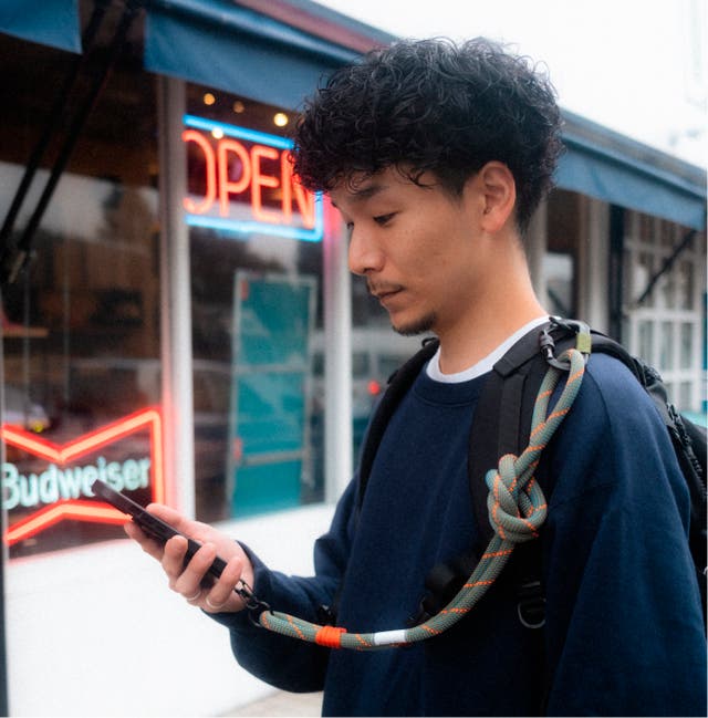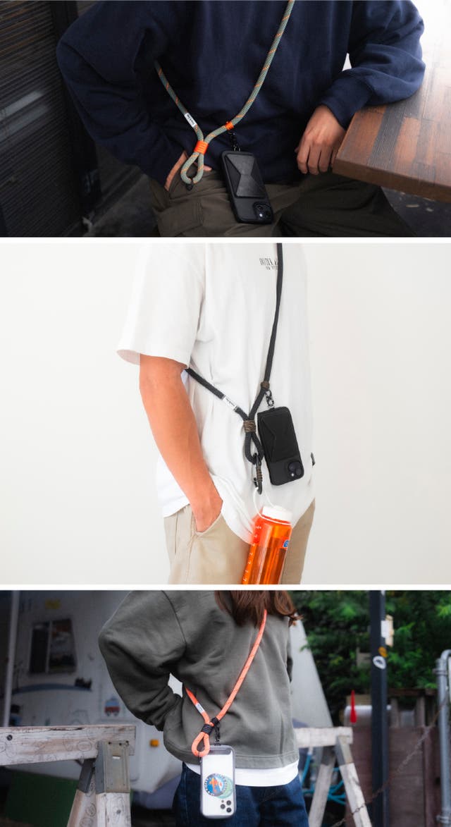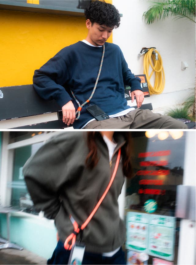 スマホショルダーは女性の方が多く使用している印象がありますが、マルチスリングはクライミングロープ素材なので性別に関わらずオシャレに使用できます。