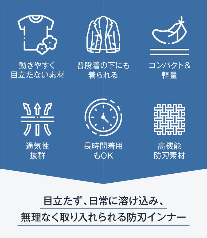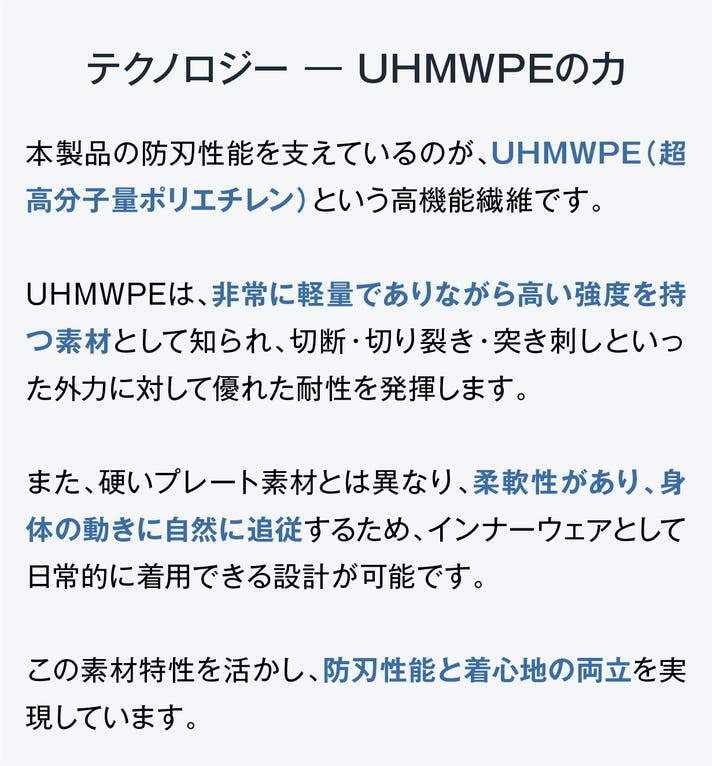 - 何もしていない不安を、着るだけで解消。EN388最高レベルの防刃性能を、日常インナーに。