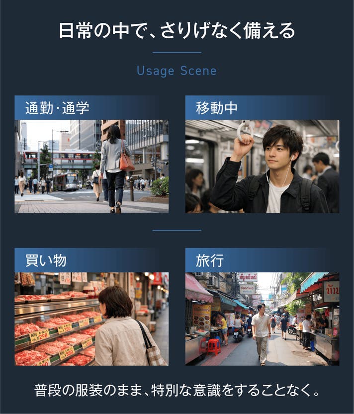 特別な対策ではなく、通勤・外出・旅行など、いつもの一日に自然に組み込めること。