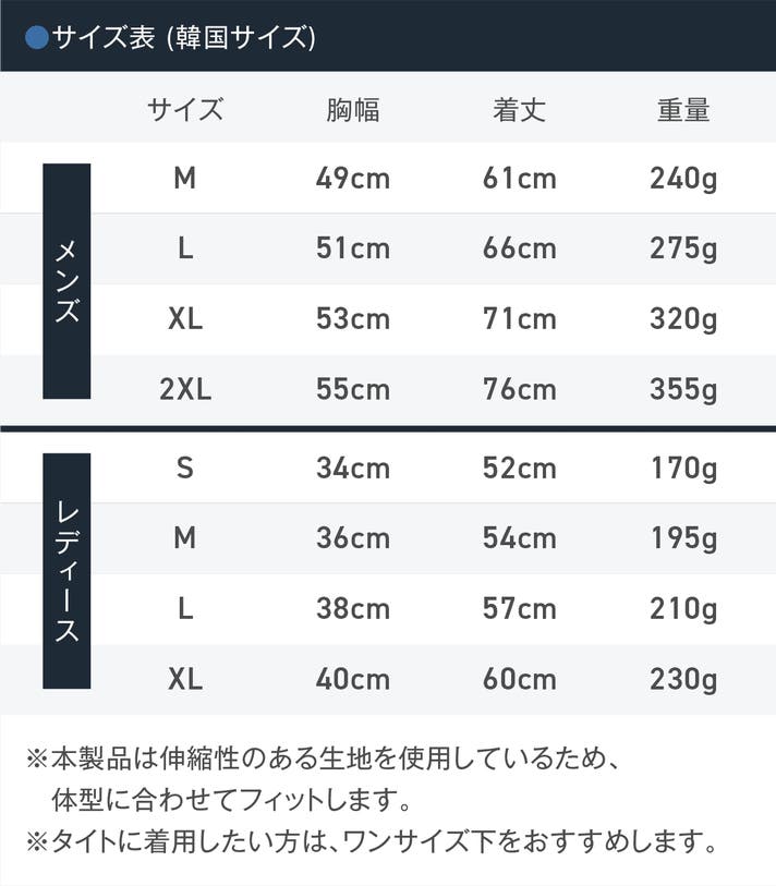 体にフィットさせたい方は、ワンサイズ下をおすすめする場合もあります。
