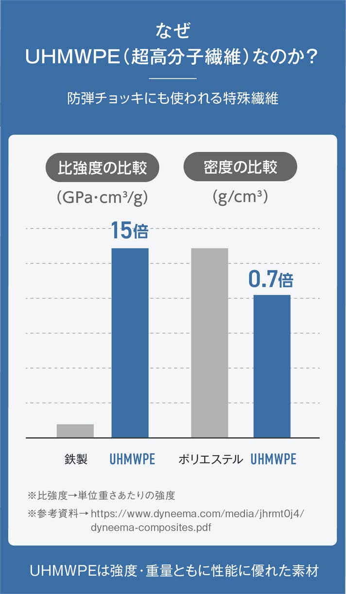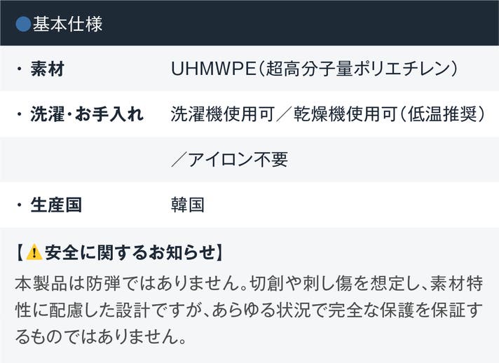 本製品には、防刃性能を担う超高分子繊維(UHMWPE)を使用しています。