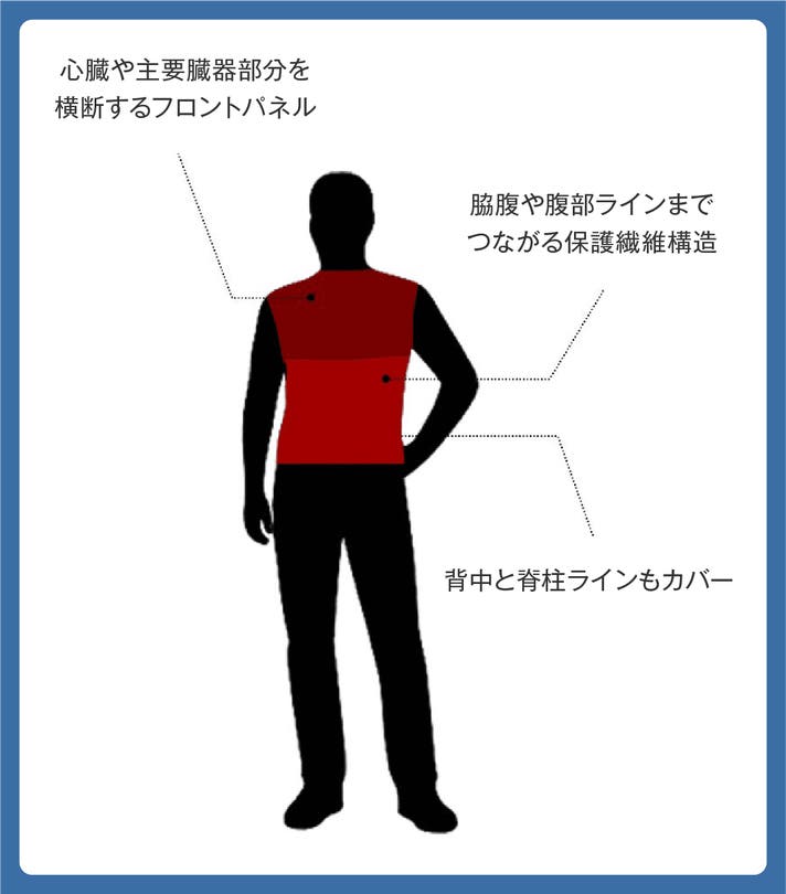 防刃層を体の中心部に配置しながら、日常動作を妨げないようストレッチ性のある構造を組み合わせました。