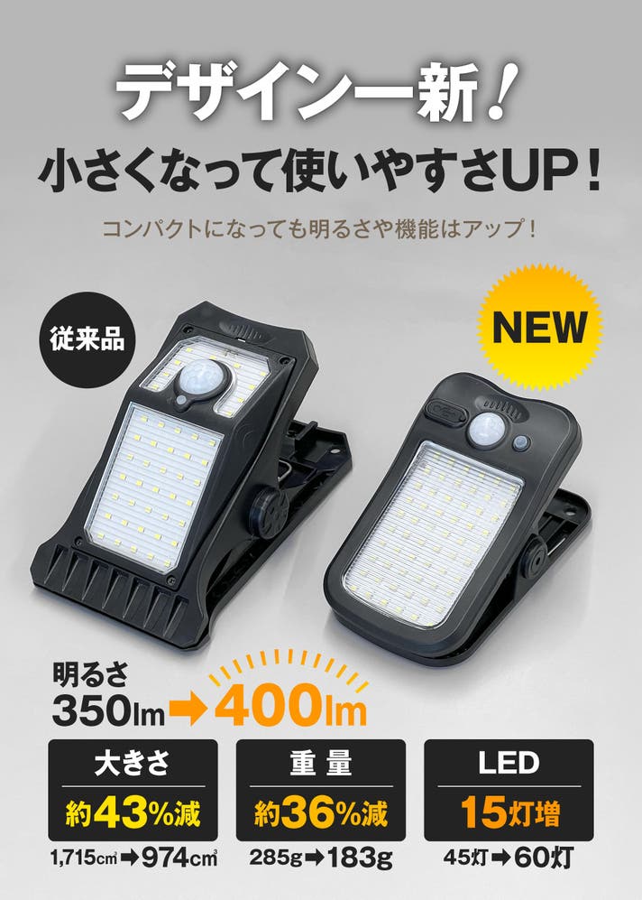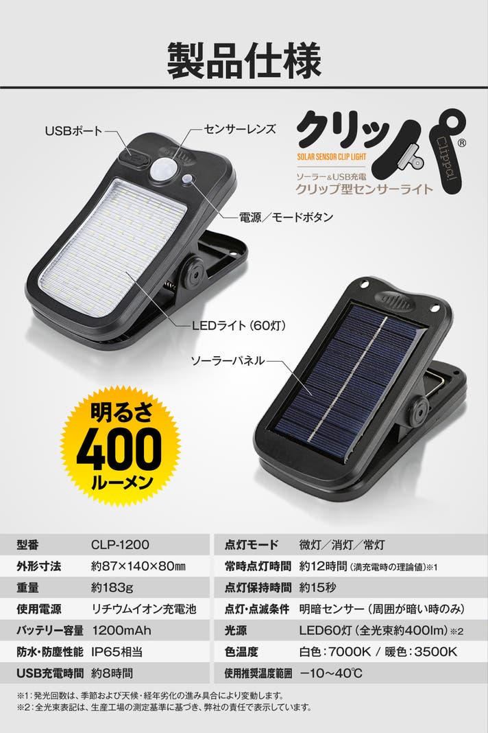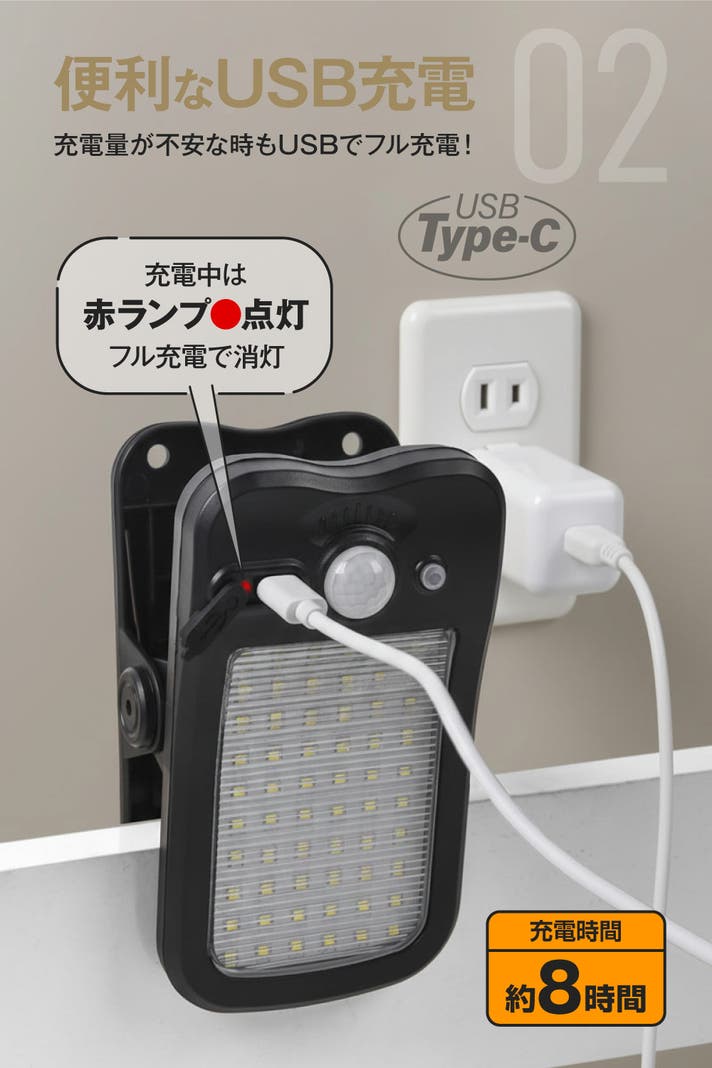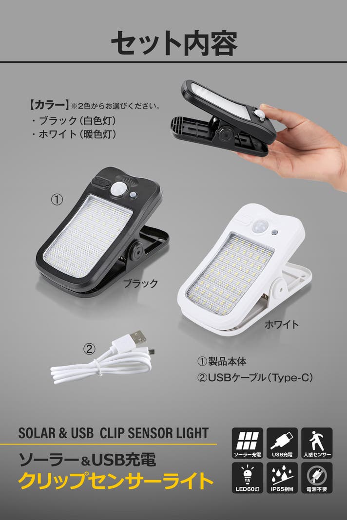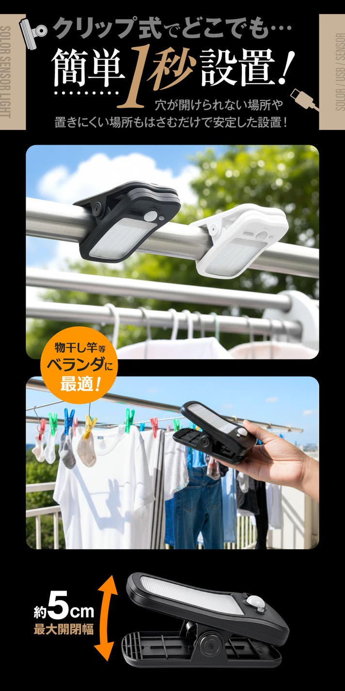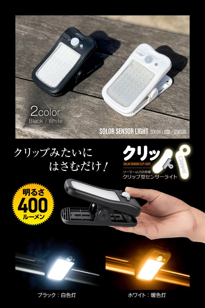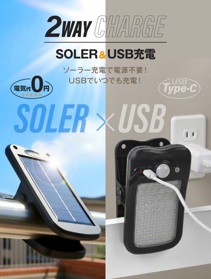 - はさんで照らす、簡単1秒設置はそのままに、明るさアップ、ソーラー&USB充電にも対応!