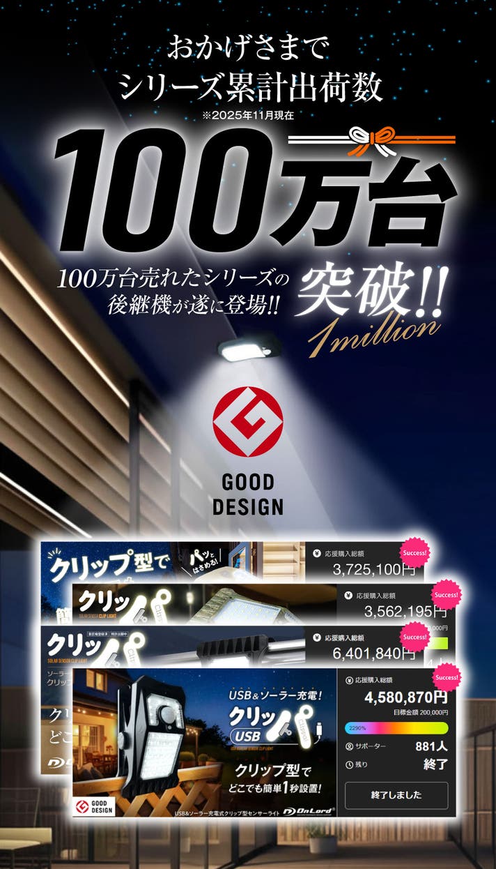 「Makuake(マクアケ)」は、実行者の想いを応援購入によって実現するアタラシイものやサービスのプラットフォームです。このページは、 プロダクトカテゴリの 「1秒設置!挟んで照らすクリップ型センサーライト「クリッパ」ソーラー&USB充電!」プロジェクト詳細ページです。