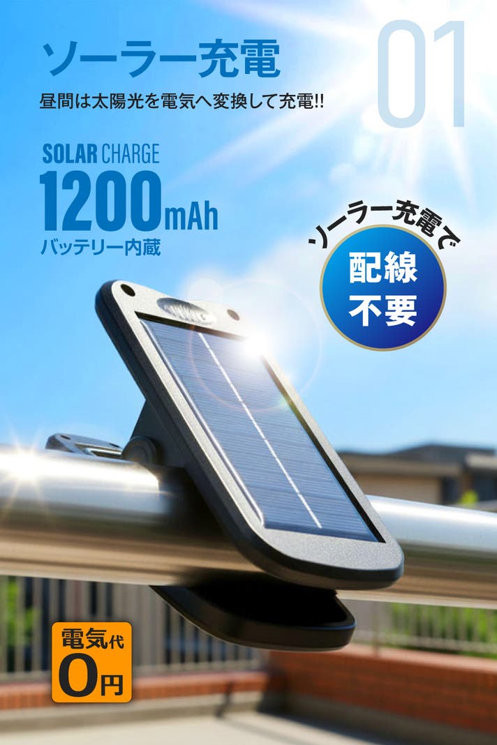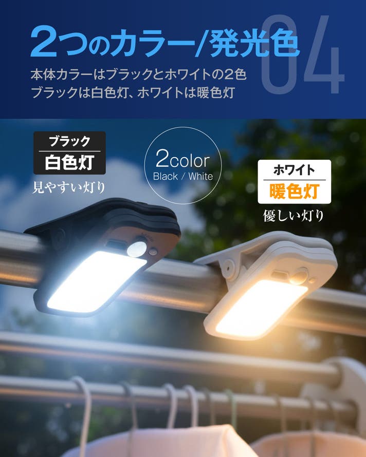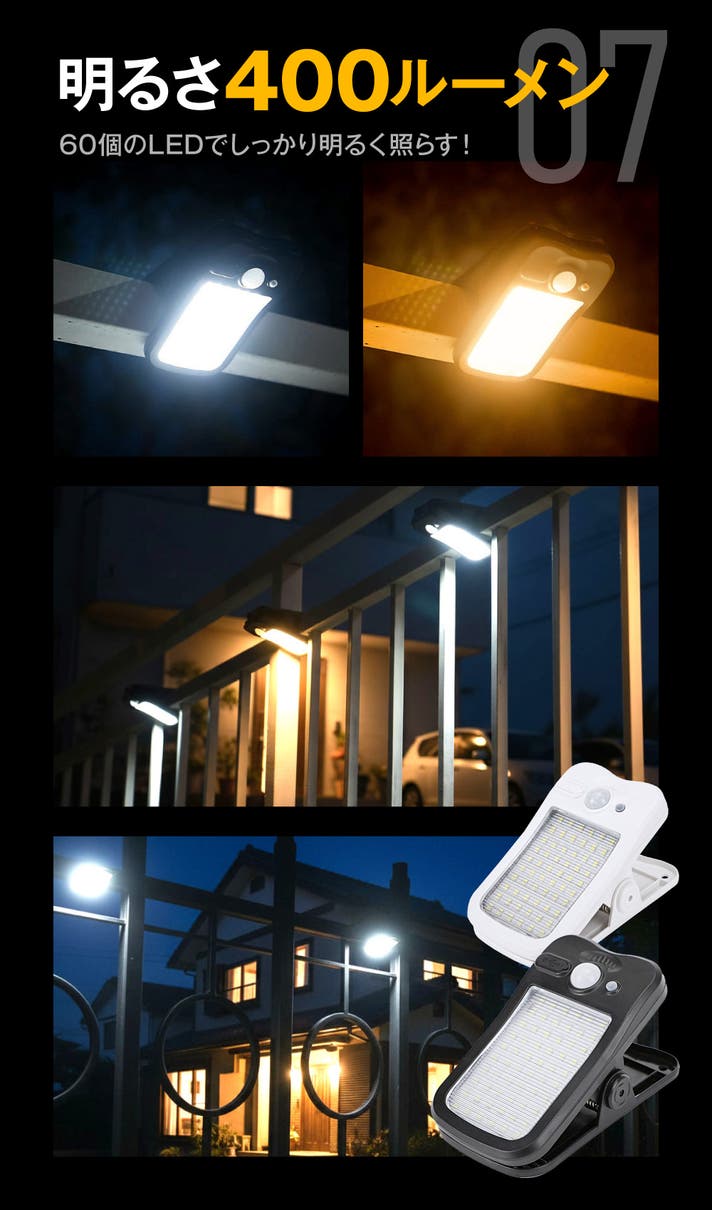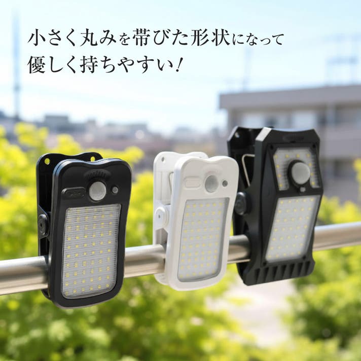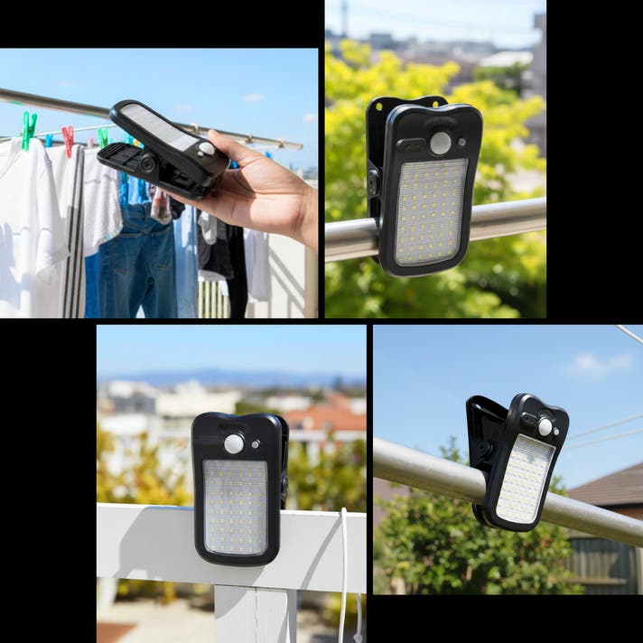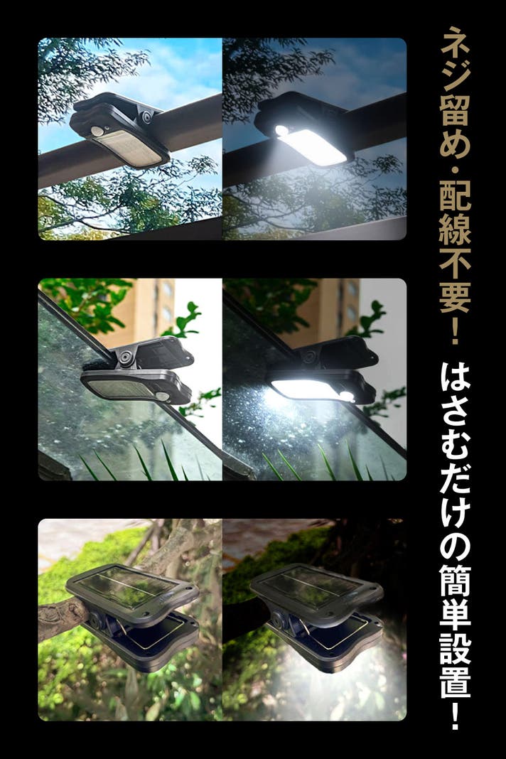 クリップ式で移動も簡単なので、昼間は日の当たる南側で充電し、夜は日当たりの悪い北側で使用することも可能です。