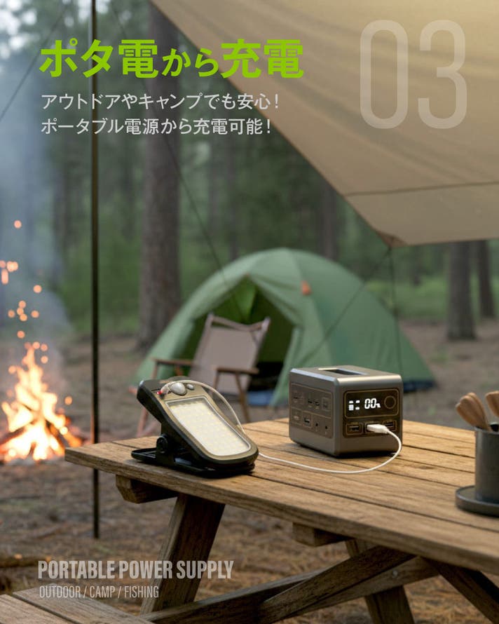 アウトドアで使用する際に、事前に充電できていなくても、移動中の車内やポータブル電源から充電できます。