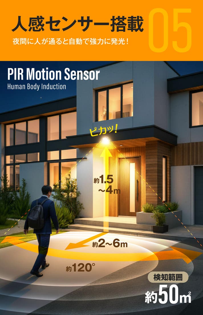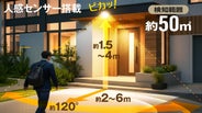人感センサー搭載で、防犯ライトやウェルカムライトとしても役立ちます。検知範囲はなんと約50㎡。防犯ライトとして手の届かない高さに設置してもセンサーがきっちり人に反応します。