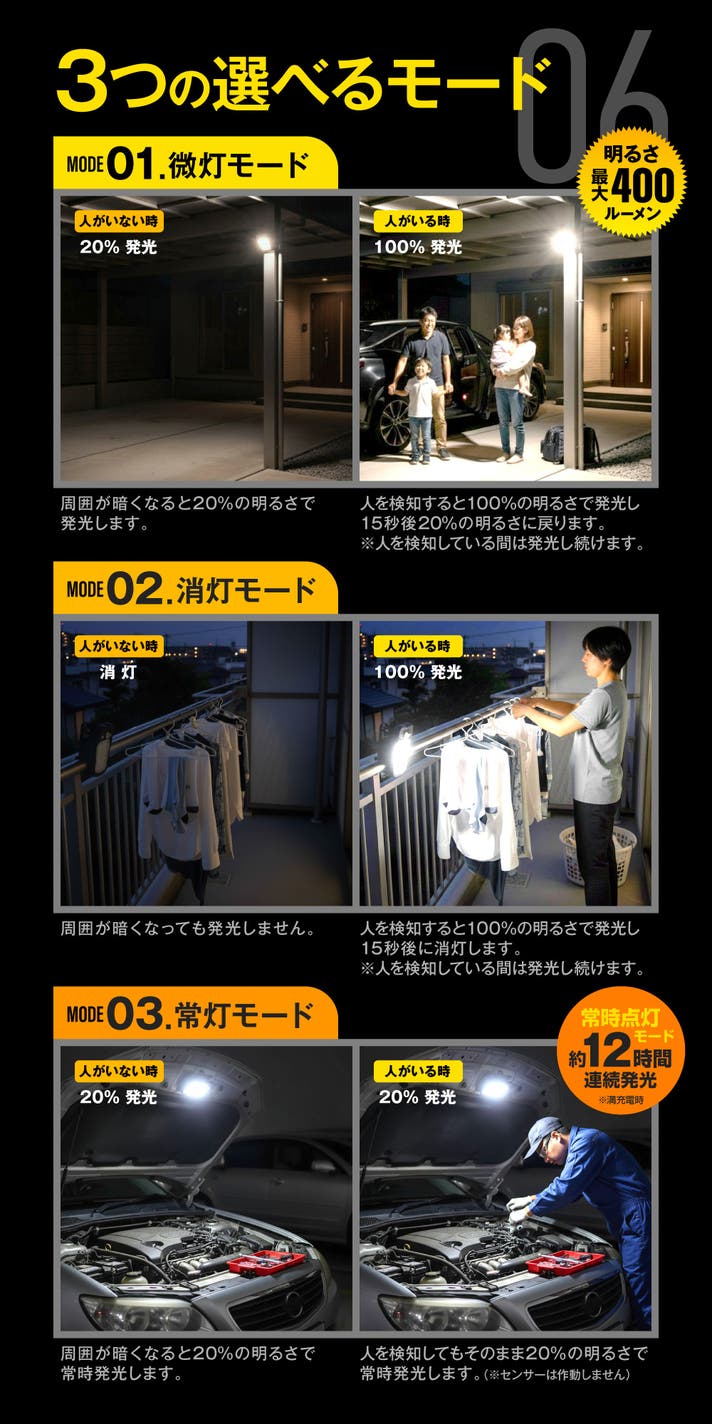 点灯モードは3種類、スイッチでモードを選択しておくだけで、周りが暗くなれば自動的に発光し、明るくなれば自動的に消灯します。