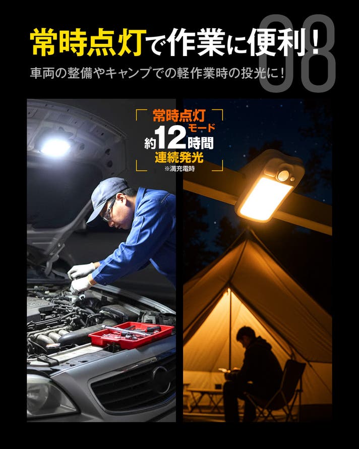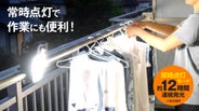 常時点灯モードは常に20%の明るさで発光するため、夜間の軽作業にも最適。クリップではさめる場所ならどこにでも取り付けられ、車の整備やテント内の照明など便利に使えます。