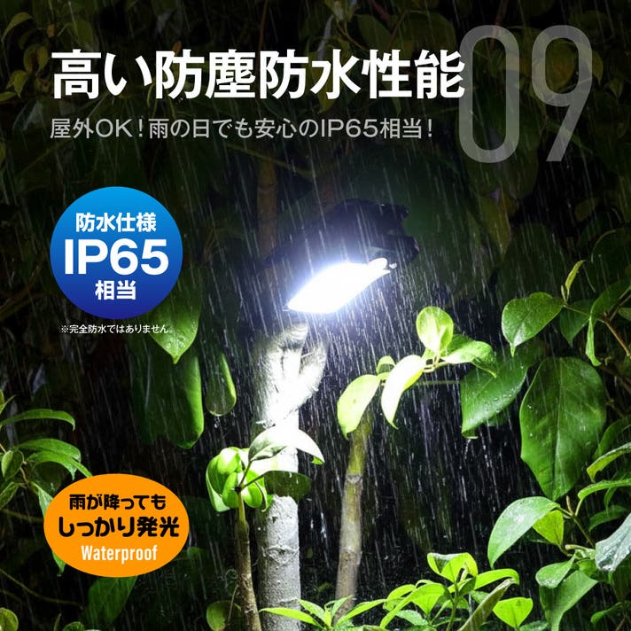 IP65相当の防水性能で雨が降っても大丈夫。※IP65適合証明書を取得しておりますが、発光面を真上に向けての使用は故障の原因となります。