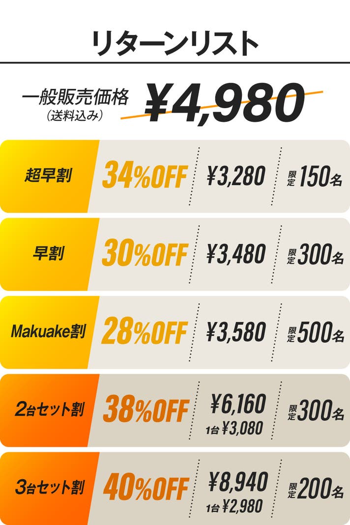 ※皆様の応援購入により量産効率が向上した場合、正規販売価格が販売予定価格より下がる可能性もございます。