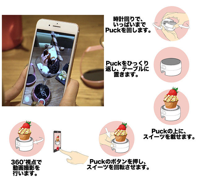 カフェで出会った美味しいスイーツをCliquFie Puckの底部に載せれば、簡単に360°のビデオを取れます。面白いでしょう?