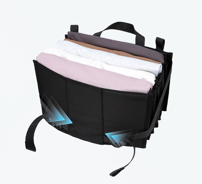 衣類収納バッグは、5つの独立スペースに仕切られており、シャツ・パンツ・下着など、種類ごとに分けて整理できます。左右のストラップで容量を調整でき、必要に応じて拡張・圧縮が可能です。