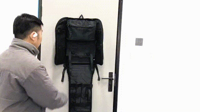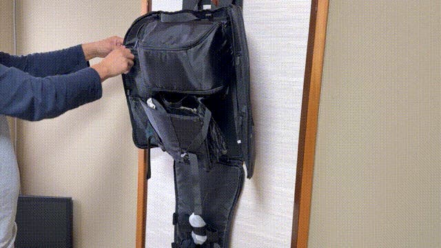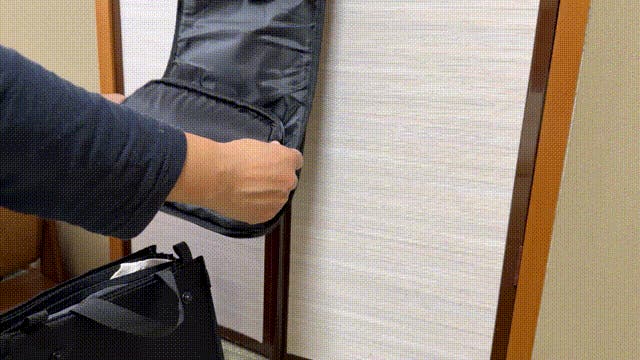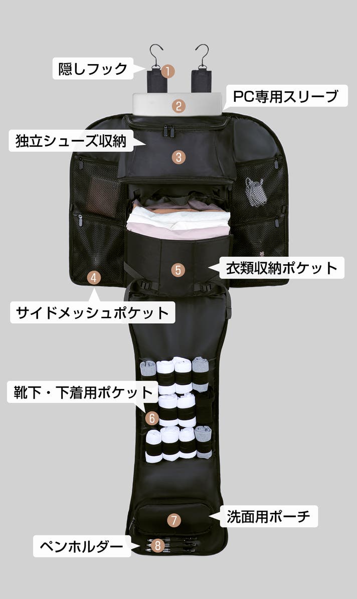 ホテルでもそのまま“吊り下げて使える”ため、ビジネスパーソンの移動をより快適にします。