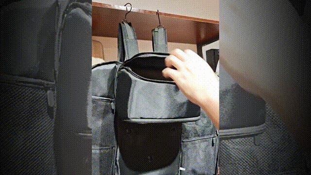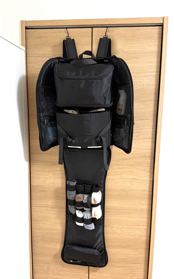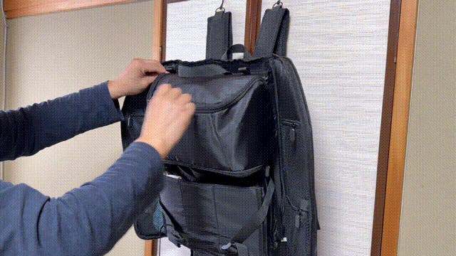 さまざまな場所に安定して吊り下げることが可能。バッグを吊るした状態で開くと、内部の収納が「壁掛け収納」のように整然と広がり、必要な物がひと目で分かります。