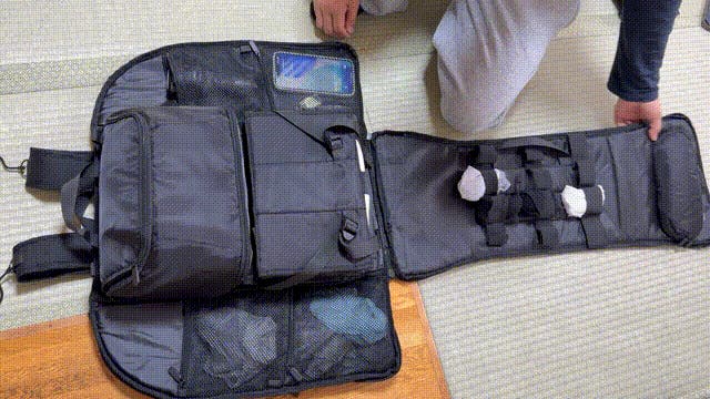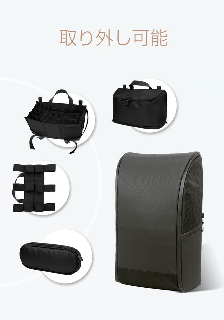 このバックパックは、大きく開いて中身を一望できるフルオープン構造。内部には多彩な収納機能が備わり、荷物を「仕分けて、整えて、すぐ取り出せる」よう工夫されています。各収納パーツは取り外し可能で、使うシーンに合わせて自由にレイアウト変更が可能。