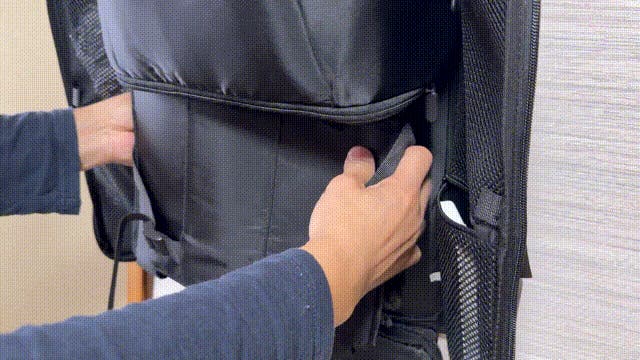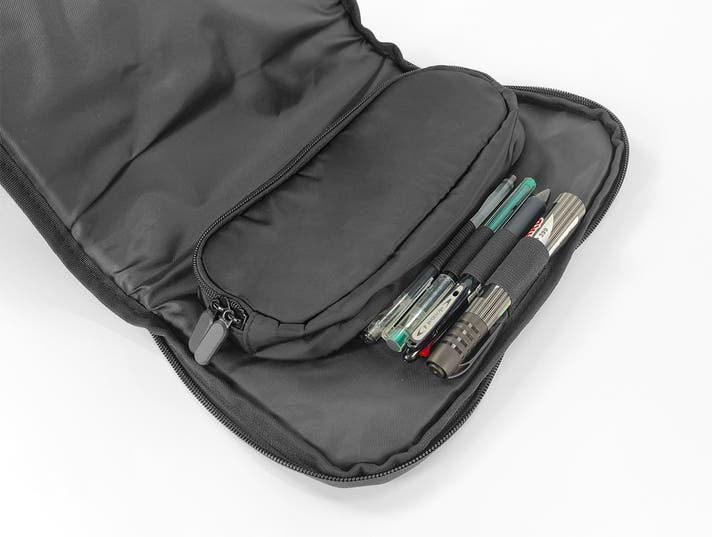 左右の内部には、合計4つのファスナー式メッシュポケットを配置。充電器、マウス、財布、鍵、各種カード類など、細かなアイテムをまとめて収納できます。