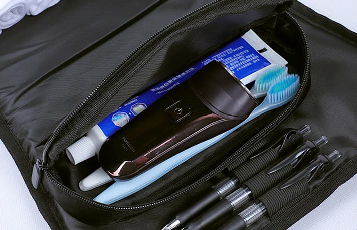 歯ブラシ、歯磨き粉、シェーバー、スキンケア用品、化粧品など、出張や旅行で必要なアイテムをひとまとめに整理できます。