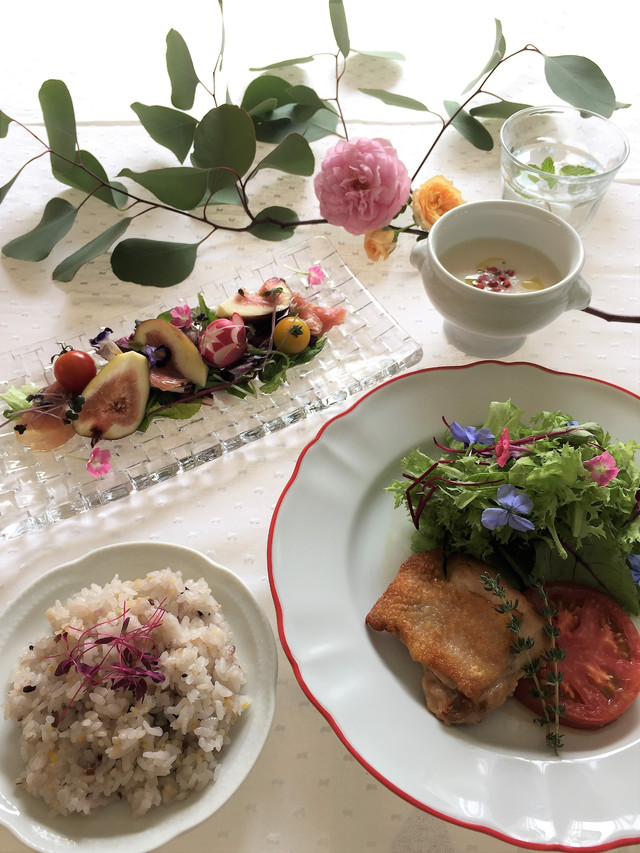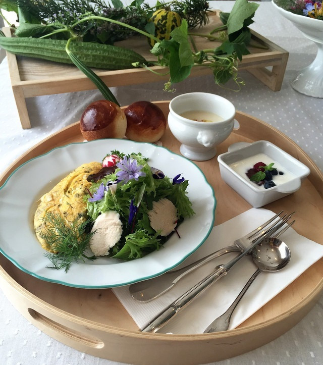 ・セット内容:季節のポタージュ・スープ、季節の玉子料理、自家製鶏ハムとたっぷりフレッシュサラダ、手作りジャム入りヨーグルト、ご飯又はパン
