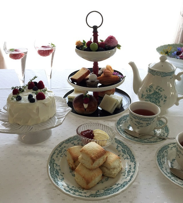 ・アフターヌーンティーのセット内容:スコーン、焼き菓子、ケーキ、サンドウィッチ、紅茶、苺スカッシュ