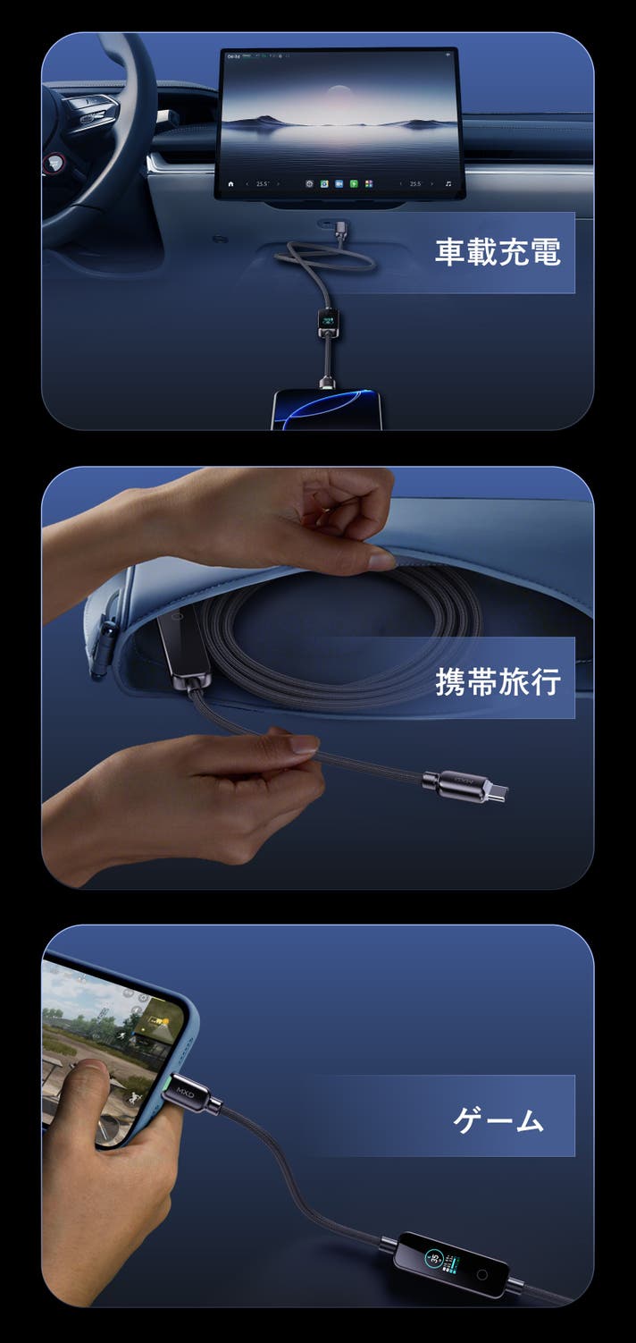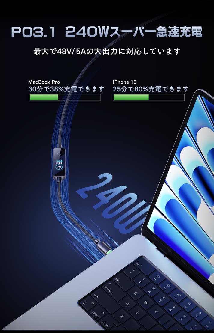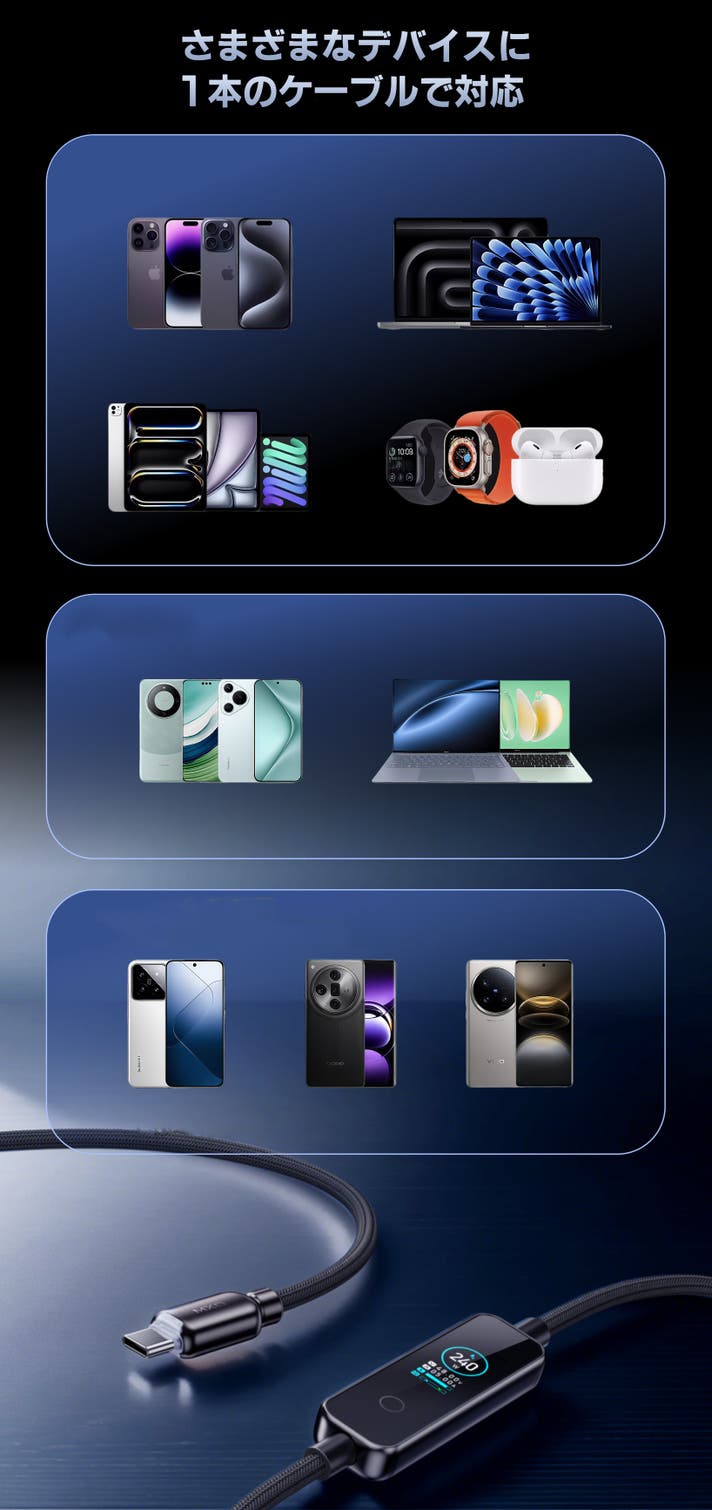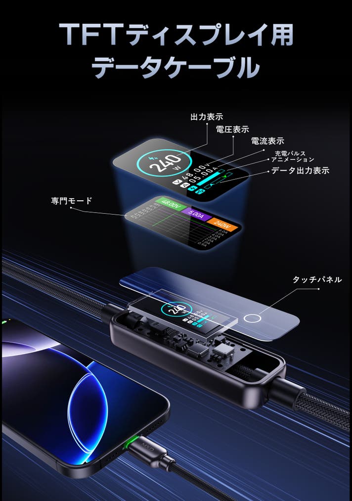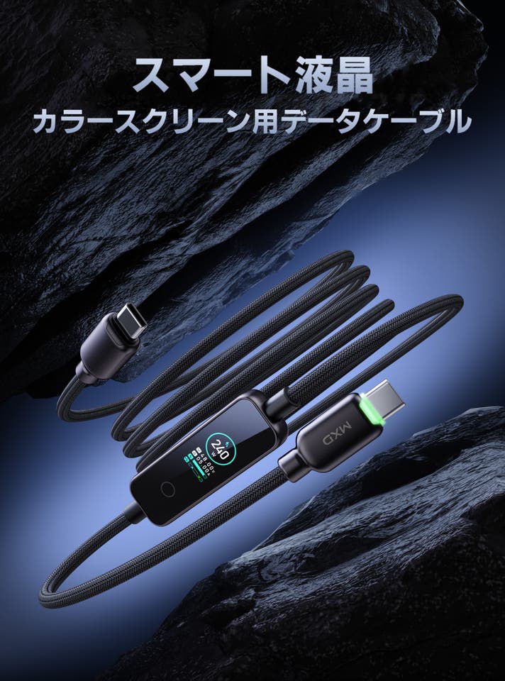 「ただの充電ケーブル」ではなく、**可視化ケーブル**という新しいコンセプト。240W超高出力、LEDインジケーター、リアルタイム液晶表示を搭載し、