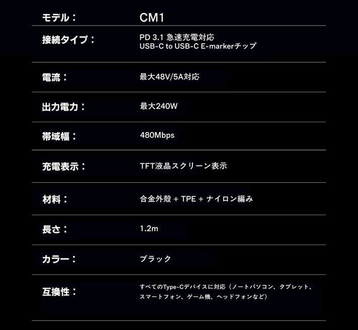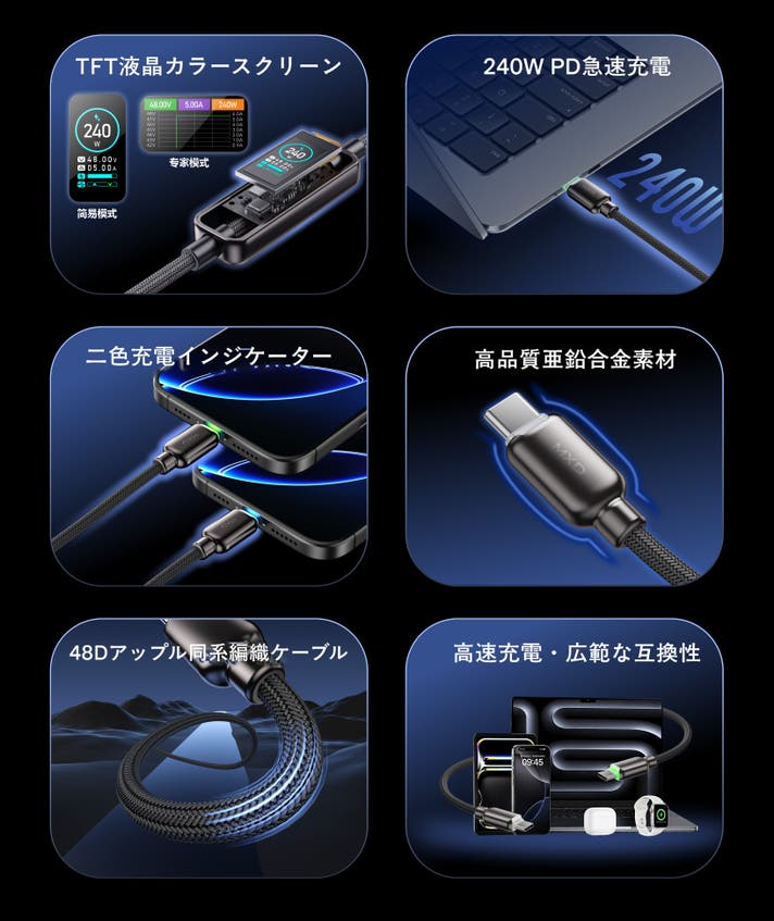 本製品は充電性能・耐久性・データ転送・視認性を融合した次世代仕様。 特に「リアルタイム表示ディスプレイ」と「240W急速充電」の両立は、市場でも稀少な特徴です。
