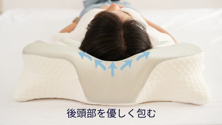 導き枕の両サイドは、翼のような形の「横向き寝サポートゾーン」を設置。頭をのせると、ちょうど良い高さで頭部を支え、縁の盛り上がりが顔を優しく支える。