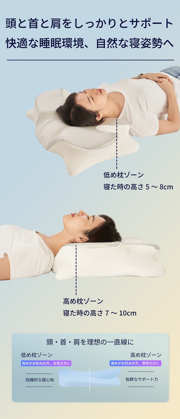 睡眠中も首が自然なカーブを保ち、立っているときと同じ理想的な姿勢をキープ。