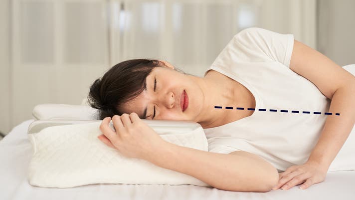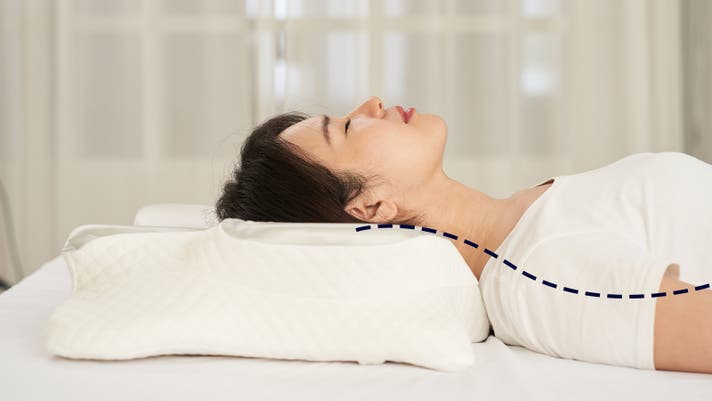 導き枕の縁が肩のラインに沿ってやさしくカーブ。