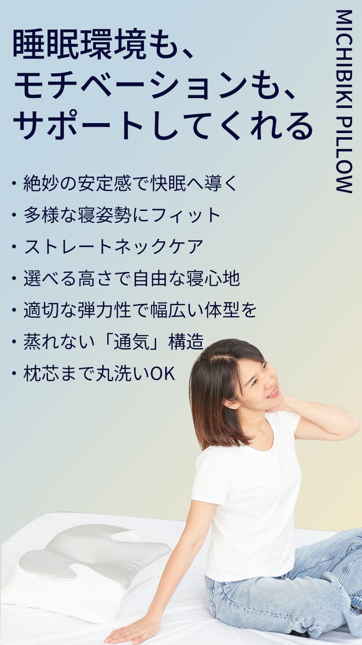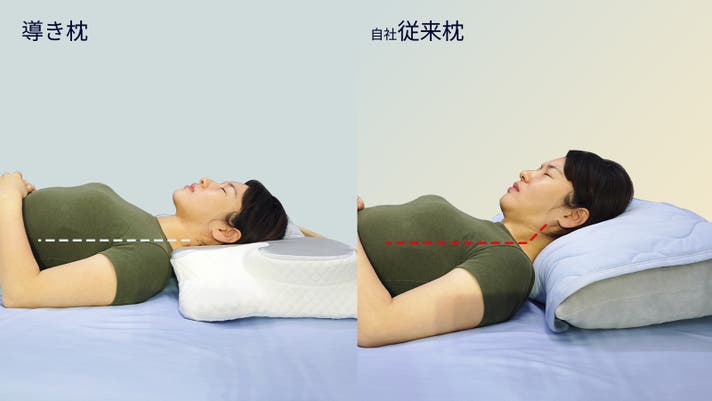 導き枕は、頭・首・肩をしっかり支えることで、背筋を自然にまっすぐにサポート。その結果、体圧が均等に分散され、就寝中の体への負担を軽減します。