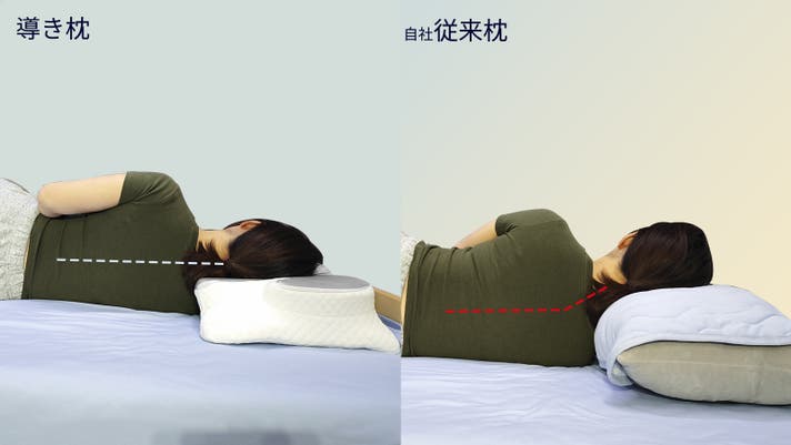 ふつうの平らな枕では、横向き寝の際に頭が枕の端からずり落ち、姿勢が崩れてしまいます。