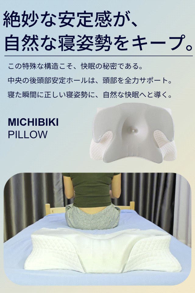 導き枕の「安定ホール」構造が、寝た瞬間から後頭部をしっかりホールド。頭が自然な位置に定まるので、無理のない姿勢でくつろげます。