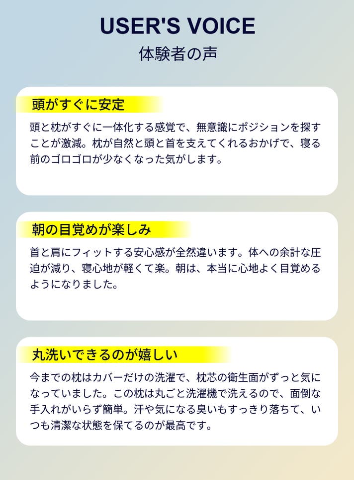 A. 枕の安定性やフィット性を重視し、首や肩の違和感を緩和したい、ほど良い反発力が好きな方に特におすすめです。