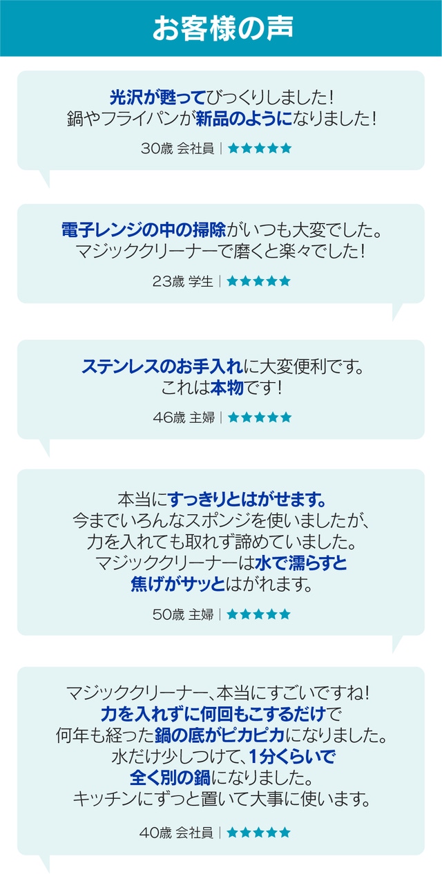 細かい研磨粒子で磨くため、強い力は必要ありません。 水を含ませたマジッククリーナーで汚れた部分をこすっていただくと、あっと言う間に汚れや焦げなどが消えていきます。