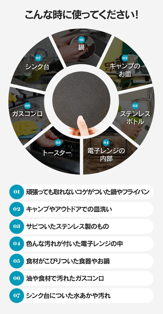 この商品を輸入しようと思った理由:毎日使うスポンジ。ただ鍋などのコゲや長年ついたキズがなかなか取れず困っていました。そういう時にこの製品を発見し、是非多くの皆様に紹介したいと思いました。