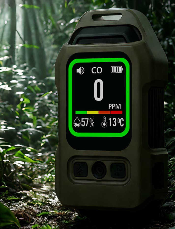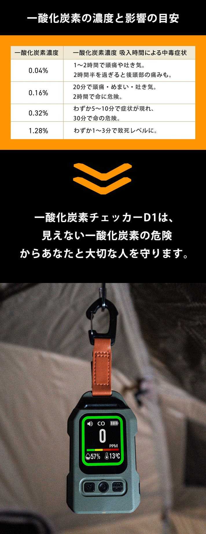 一酸化炭素チェッカーD1は高感度センサーでCO濃度をリアルタイム監視。50ppmを超えるとLED警告とアラームで即通知。USB充電式&最大300時間稼働で、屋外でも安心して使えます。