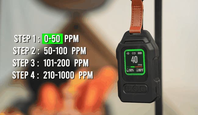 - 0~1000ppmの一酸化炭素をリアルタイム検知。4段階の警報音&警告灯で危険を即座にお知せ。