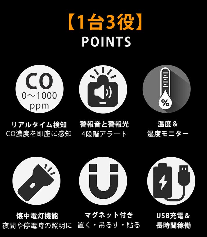 機能:一酸化炭素濃度検知、温度&湿度モニタリング、懐中電灯
