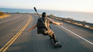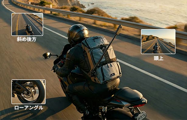 しかし、1.5mの撮影アームは背中の後方から斜め上へと伸び、まるでドローンが追従しているかのような第三者視点の映像を可能にします。